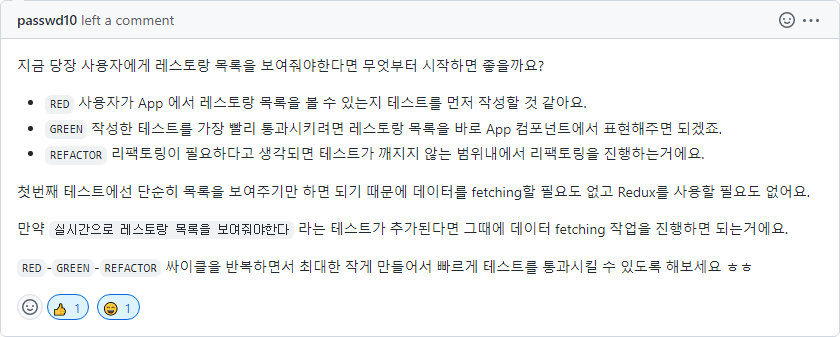 지난 TIL에서 App처럼 큰 컴포넌트에서 TDD를 어떻게 시작하고, 커밋을 어떻게 나눠야 할지 모른다고 했었는데 그에 대해 트레이너님이 팁을 주셨다.